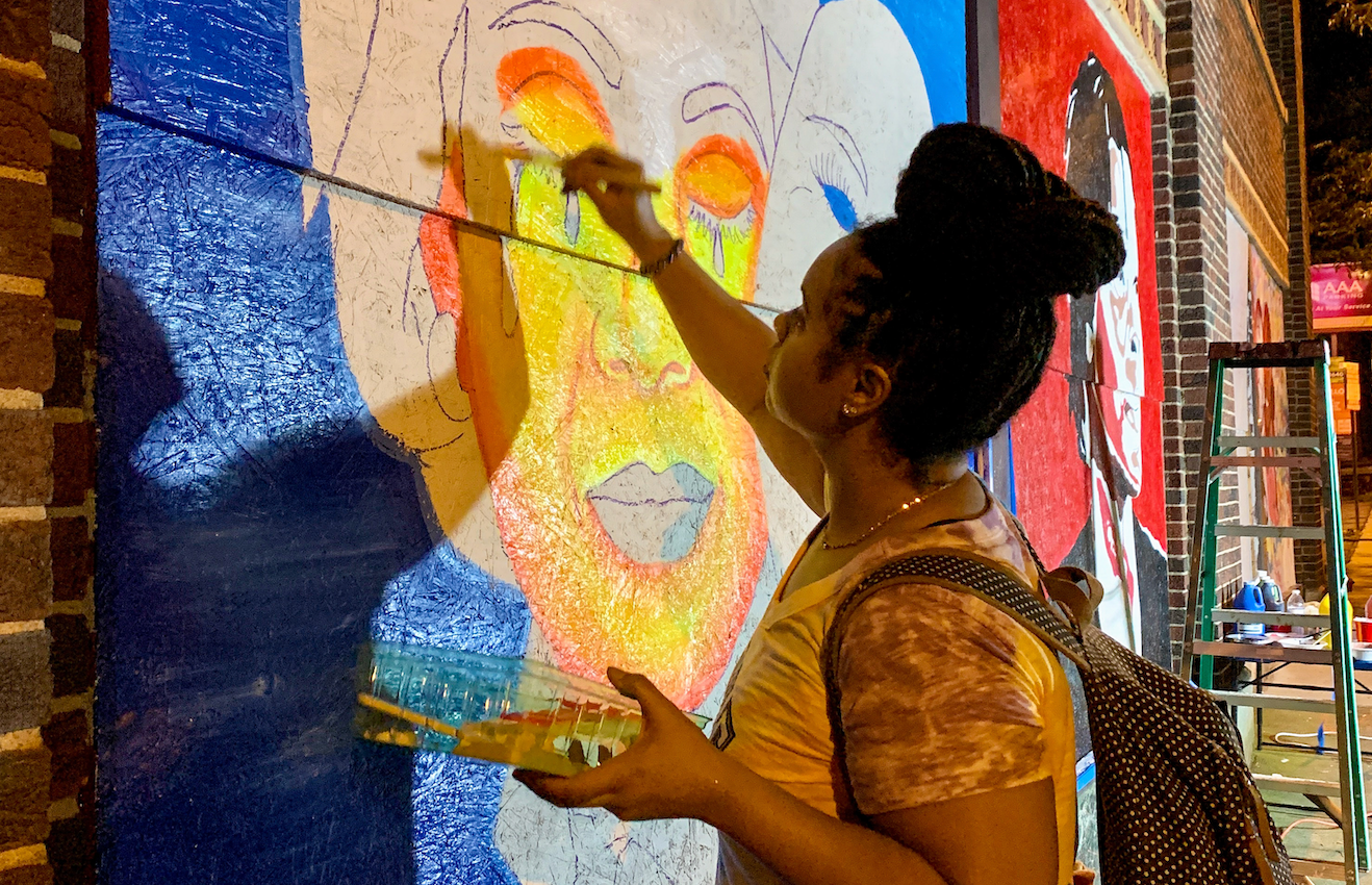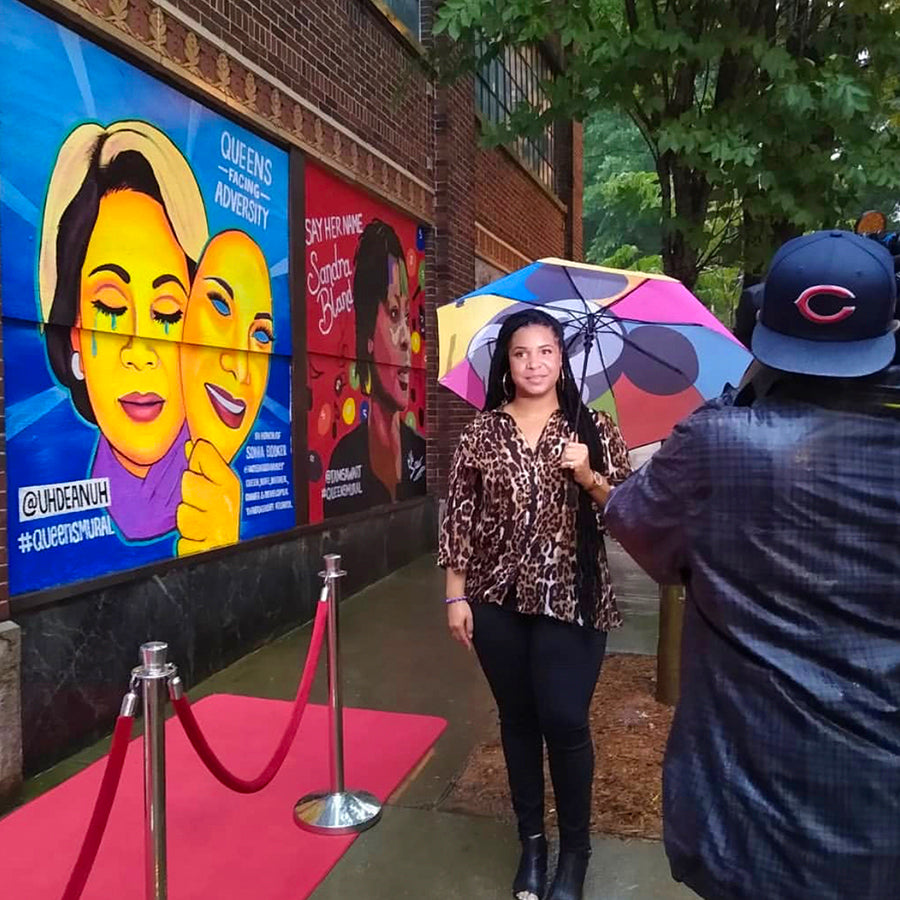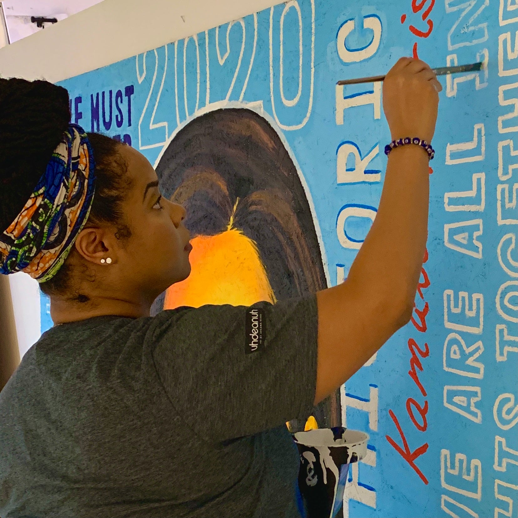 Peaceful protest turned destructive riots one evening in Atlanta. Owner Sonia Booker had to board up broken windows at her shop on John Wesley Dobbs Avenue, but now those boards are works of arts paying tribute to women effected and lives lost by police brutality. Adeana was inspired by owner Sonia's story of being inspired to be involved and painted her as the muse behind her board "Queens Facing Adversity."