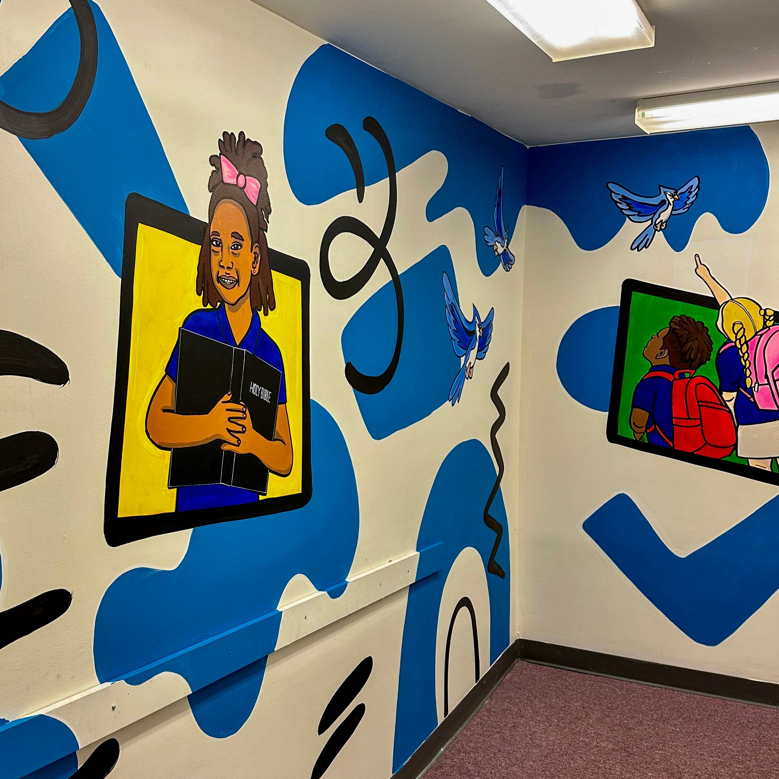Recently Adeana had the honor and privilege to create and paint hallway murals at St. John Baptist Church Preschool in Columbia, SC. With a short timeline of just one week before open house, she was able to create the designs and then implement them within 4 long days! The overall process and completion was so rewarding.